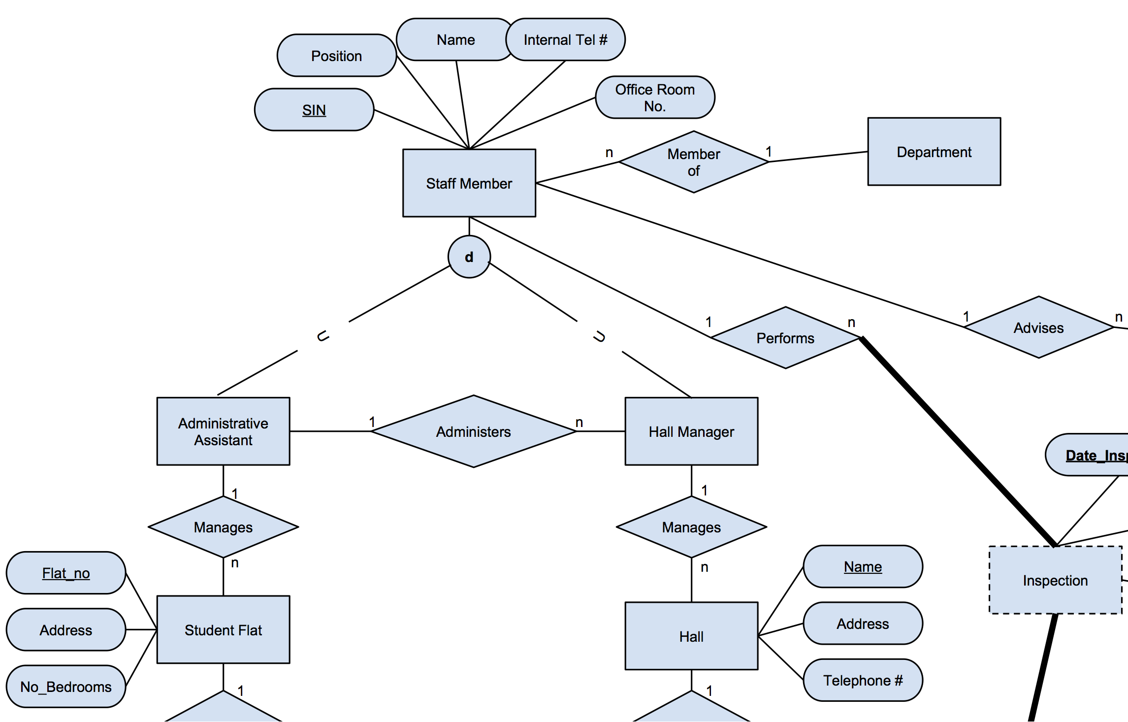 Northfields practice EER diagram for a database course. This diagram represents the relationships between multiple actors and entities of a university accommodation office. |
