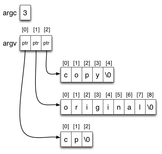 char* argv[] is an array of char pointers. The argv array is argc+1 pointers long. The zeroth entry in argv is always the program's own name (what use is this?). The subsequent entries are the program arguments in order. For our cp example the contents of the array are:
