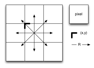 Note: this is 9 white pixels in the center of the image. Why does a radius of 1 cause 9 pixels to be filled? We are considering all the points in the pixel and not just the point at the centre of the pixel. This diagram shows all the pixels that contain points less than R=1 from the center of the pixel at (x,y):
